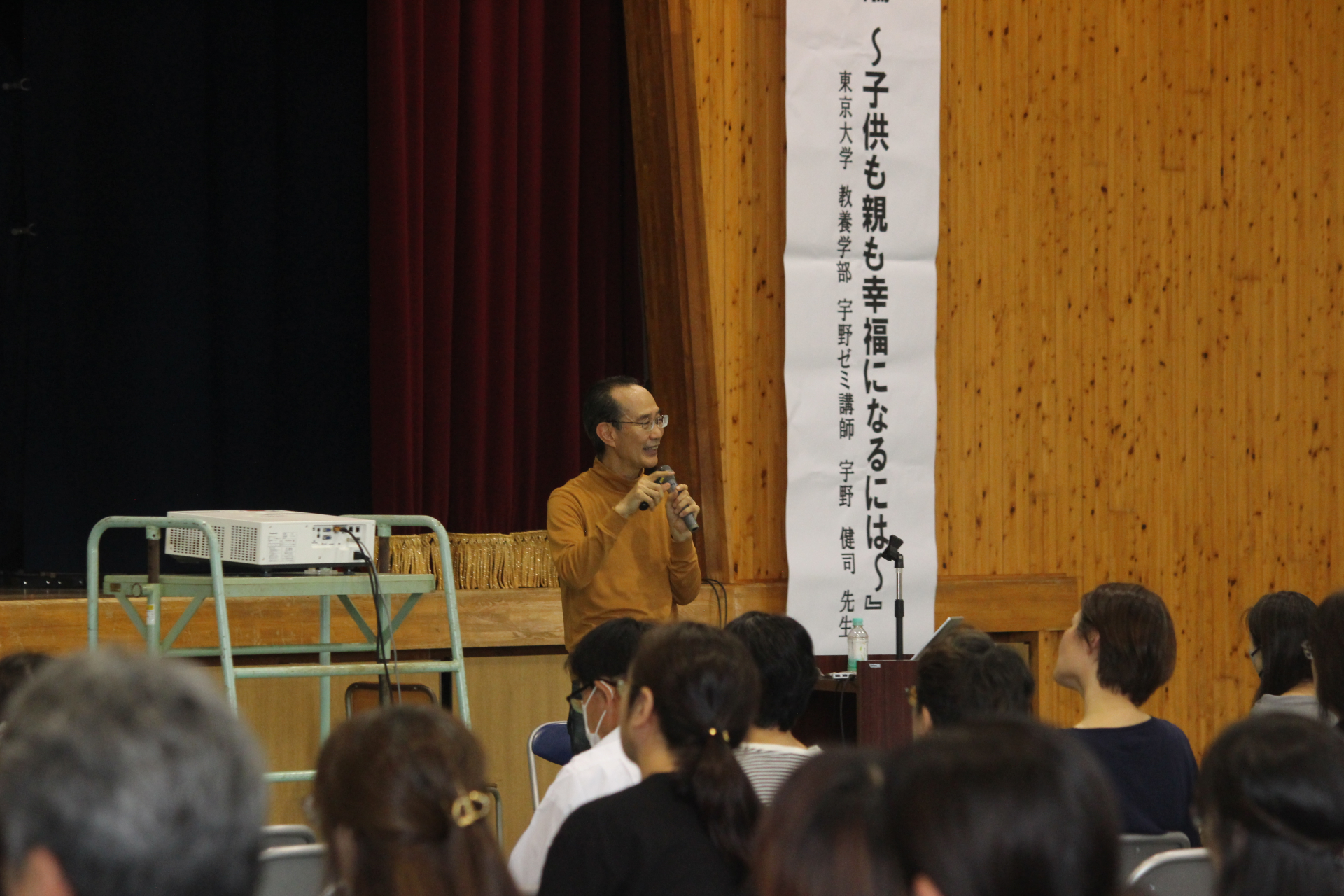 また、午後からは、本校生徒の保護者の方を対象として、お子様の授業参観・研修講演会・進路説明会をしました。土曜日ということもあり、400名以上の保護者の方が参加されました。研修講演会では、東京大学教養学部の宇野健司先生をお招きして、「幸福論~子供も親も幸福になるには~」と題して講演していただきました。「グループワークするので、3人組になってください」というアナウンスから始まり、「みなさんは東大1年生になったつもりで講演を受けてください」「私語したら退場です」など、ユーモア溢れる語り口に多くの保護者の方は魅了されたと思います。参加された保護者の方は、「幸福」についてのグループワークを通じてさまざまな考え方や価値観を共有されたと思います。幸福とは何かのヒントが得られた90分だったと思います。午後からの行事に参加いただきました保護者の皆様方、ありがとうございました。