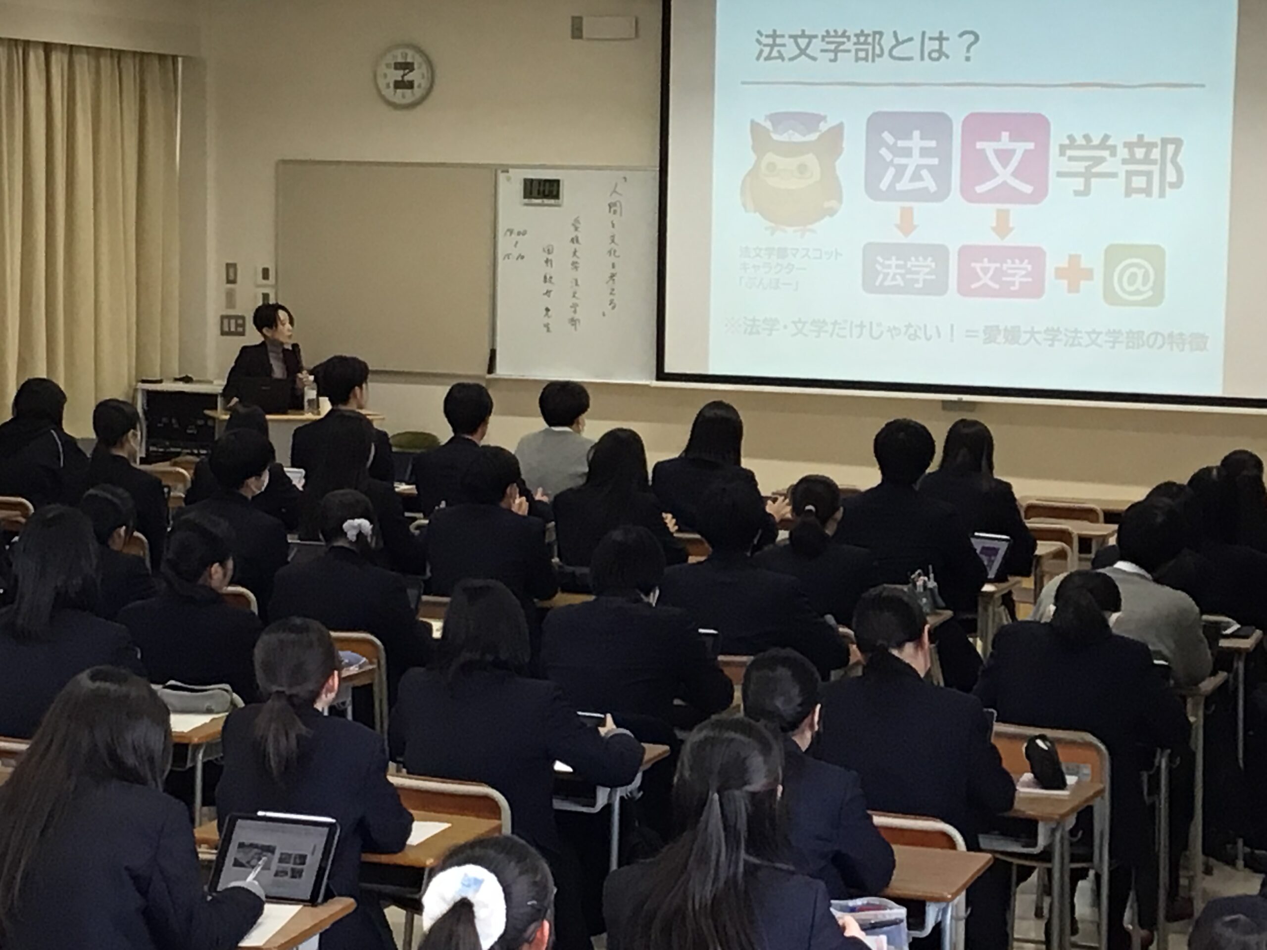 3月4日(水),愛媛大学法文学部から田村紋女先生をお招きして標題のオープン講座を開講しました。1・2年次生から70人を超える参加がありました。はじめに,全国的にも珍しい「法文学部」の特徴やカリキュラムについてご紹介いただき,同じテーマでも心理学や法学などさまざまな視点から学べることなどを説明してくださいました。その後,ご専門の人格心理学についての概略を,心理学の領域,血液型診断を例にした調査方法や問題点,人格心理学の代表的な理論,サイコパシーなどに触れながら講義していただきました。参加者はデジタル資料を参照したりメモを取ったりしながら,熱心に耳を傾けていました。大学研究や学問研究の観点からも大変有意義な時間になりました。