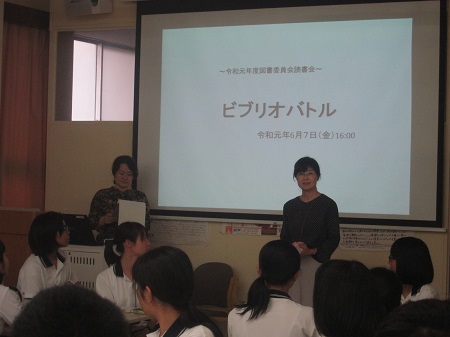 6月7日(金)放課後、図書館にて「図書委員会ビブリオバトル」を開催しました。今回は、図書委員1・2年生に加え教育実習生6名も参加してくださいました。参加者はそれぞれお気に入りの1冊を持ち寄り、その本と出会ったきっかけや感銘を受けたところなど本の魅力を紹介し合いました。接戦を制しチャンプ本に選ばれたのは1年男子が紹介した『砂漠』(伊坂幸太郎)です。図書館に展示していますのでぜひ読んでみてください。